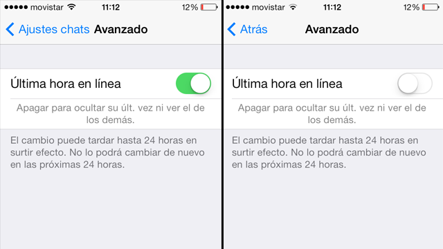 Los usuarios de dispositivos con iOS pueden ocultar también su última conexión pero solo pueden activarlo y desactivarlo una sola vez en 24 horas. Para encontrar la opción deben ingresar a Ajustes/Ajustes de chats/Avanzado/Última hora en linea.