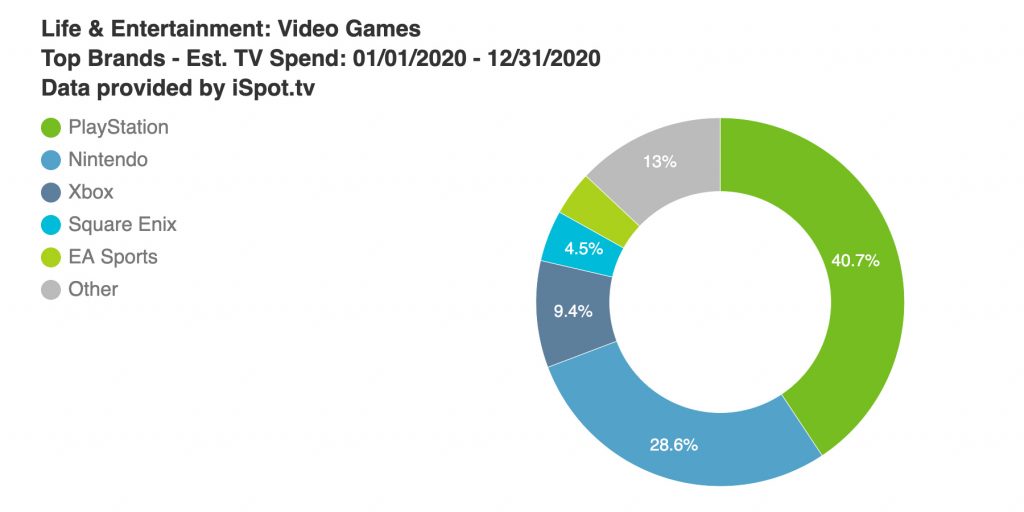 Las 34 marcas escogidas para el informe suman un total de 270,8 millones de dólares en anuncios para TV. Si bien esta cifra suena bastante alta supone una caída del 24% con respecto al 2019. De esta cantidad, PlayStation representa sola el 40,7% representando un total de 110,1 millones de dólares gastados en publicidad televisiva. Se emitieron un total de 33 anúncios en todo el país estadounidense por más 12.000 veces generando un aproximado de 4,4 mil millones de vistas.