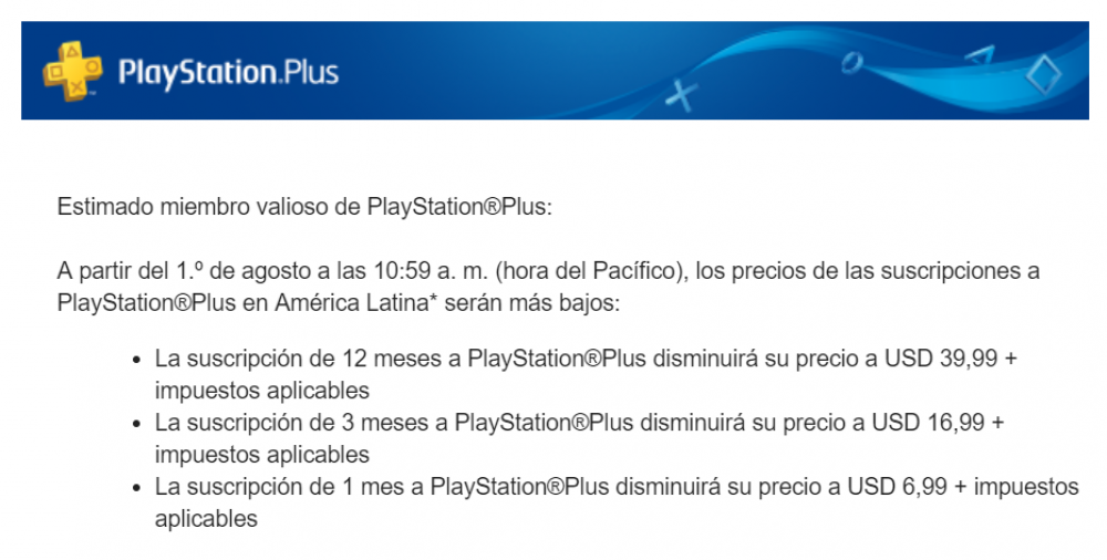 «A partir del primero de agosto, los precios de las suscripciones a PlayStation Plus en América Latina serán más bajos: