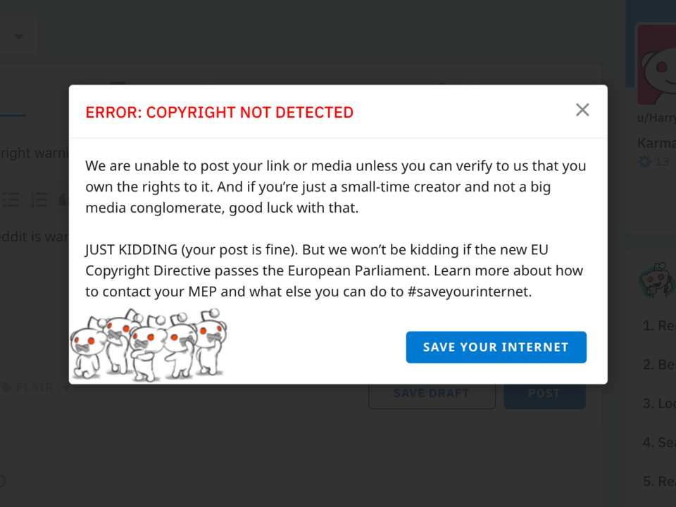 Bajo el mensaje de “Copyright no detectado”, Reddit muestra un avance de como seria su servicio de aprobarse los artículos 11 y 13