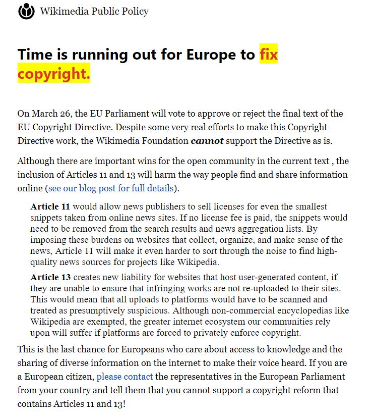 “Esta es la última oportunidad para los europeos que les preocupa el acceso al conocimiento y el intercambio de información diversa en Internet puedan hacer oír su voz. Si eres ciudadano europeo, ponte en contacto con los representantes en el Parlamento Europeo de tu país y dígales que no puede apoyar una reforma de derechos de autor que contenga los Artículos 11 y 13.”