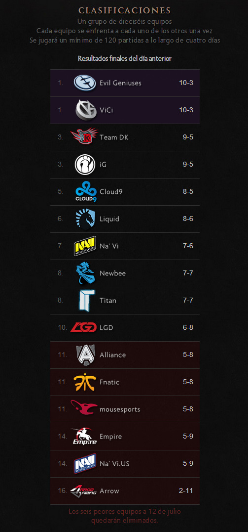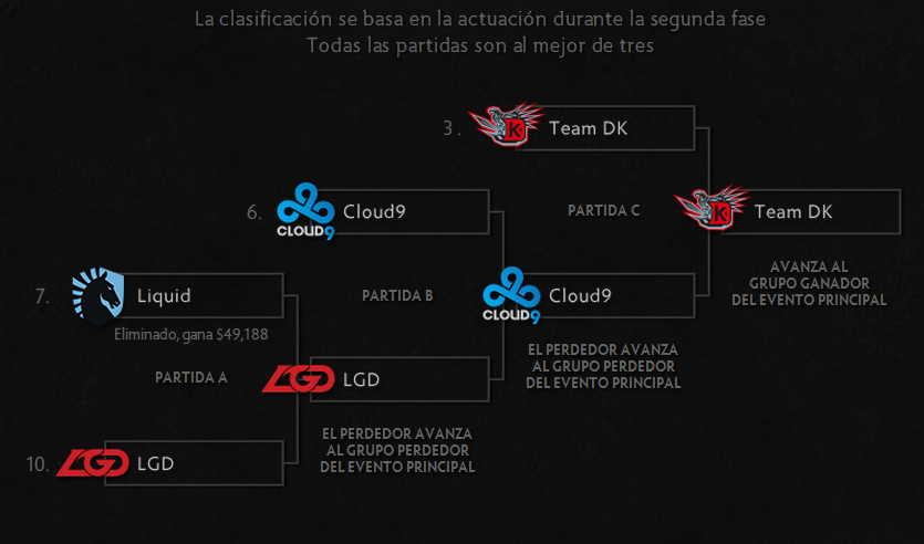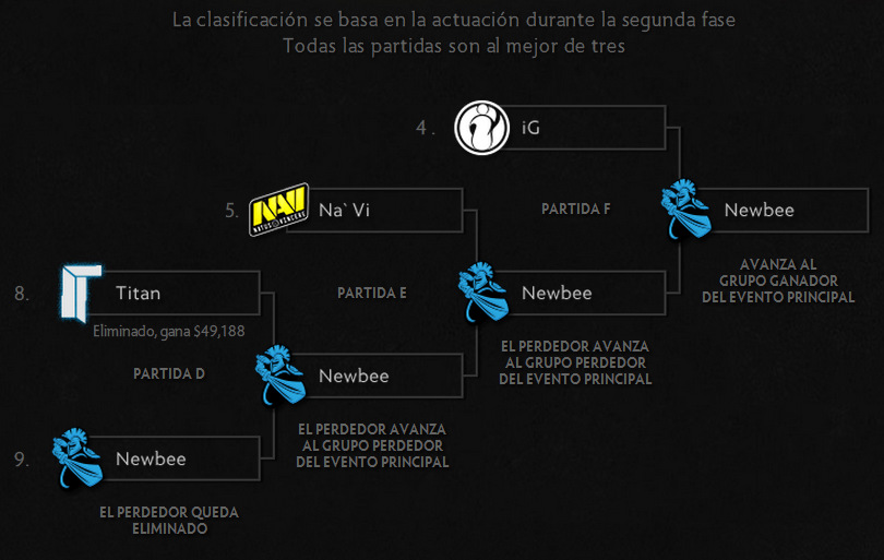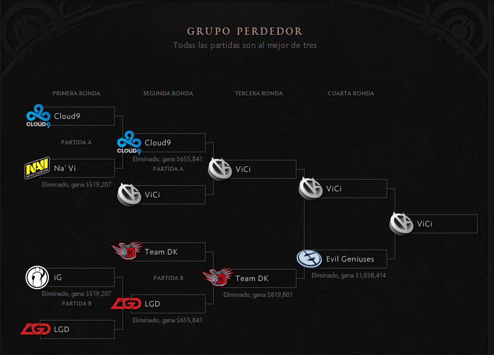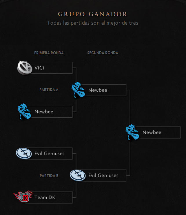 Estos fueron los resultados del primer día, donde la gran sorpresa fue Newbee. El equipo chino recientemente formado que aseguró su posición en la gran final. Incluso si pierden se llevarán a casa un premio de US$ 1,475,000 como mínimo.