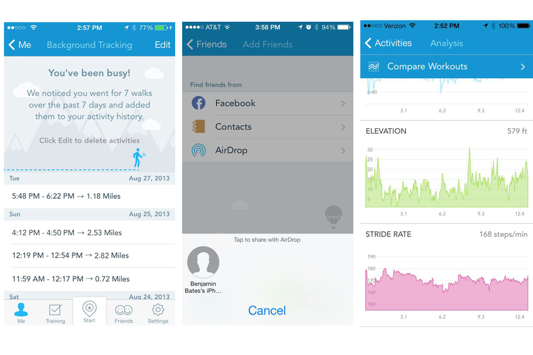 Si bien las anteriores características solo están disponibles para el iPhone 5s, los demás dispositivos iOS tendrán como novedad el soporte de AirDrop que te permite compartir tus rutinas y entrenamiento a tus amigos que estén cerca y agregarlos a tu lista de contactos de RunKeeper.