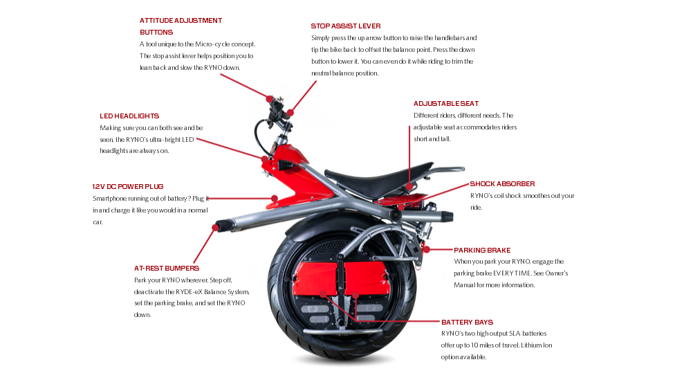 ‘Ryno’ utiliza giroscopios y acelerómetros para balancearse y avanzar. Además, es más intuitiva que otras motocicletas. Te sientas, te apoyas en ella y estás listo para conducir. Apoyarte hacia atrás baja la velocidad y simplemente debes colocar tus pies en el suelo cuando estés listo para detenerte.