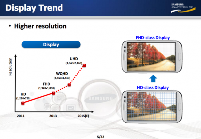 Por otro lado en cuanto al Hardware, Samsung planea el uso de resolución WQHD (2560 x 1440) en sus pantallas el próximo año y luego migrar a la resolución Ultra HD 4K (3840 x 2106) en el 2015. Estas resoluciones están planeadas para smartphones con pantLlas de 5 pulgadas a más.
