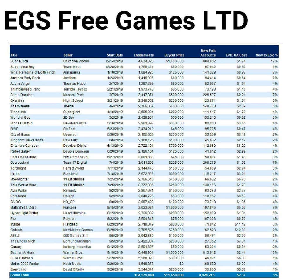 El listado muestra cuanto se pagó a las empresas por ofrecer un determinado juego gratis en su tienda. Dentro de los más destacados se puede observar los 1,5 millones de dólares por Batman Arkham, los 1.4 millones de dólares por Subnautica y el millón de dólares por Mutant Year Zero. En total la cifra asciende hasta los 11.658.000 dólares que se pagaron juegos entre el 2018 y 2019.