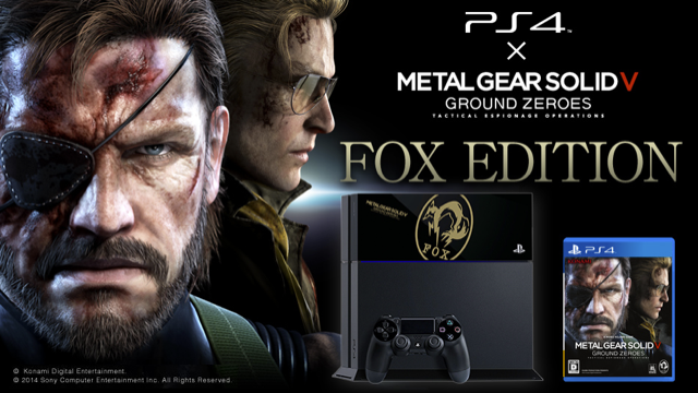 Sony y los desarrolladores de Kojima Productions han creado la primera edición limitada del PS4 exclusiva para Japón en respuesta a los tres meses de retraso. Bajo el nombre de “Fox Edition”, esta consola fue creada para celebrar el lanzamiento de Metal Gear Solid V: Ground Zeroes que viene incluida junto a la exclusiva consola por 46,980¥ (US$ 462) y la consola regular tendría el precio de 41,979¥ (US$ 413). Desafortunadamente, esta edición limitada no tiene mucho que envidiar de la edición regular, tan solo cuenta con un diseño de revestimiento y un emblema bastante simple.