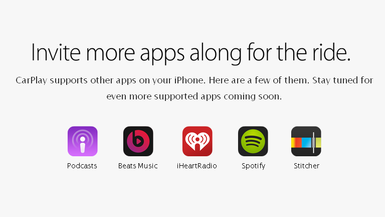 Una vez que llegué al mercado en los vehículos, será compatible con otras aplicaciones como Spotify, Beats Music, iHeartRadio, Stitcher y Podcasts. En cuanto a dispositivos compatibles serán el iPhone 5S, iPhone 5C y iPhone 5.