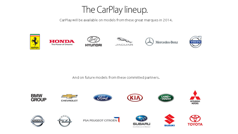 CarPlay estará disponible en algunos autos seleccionados este 2014 que incluyen las marcas Ferrari, Honda, Hyundai, Jaguar, Mercedes-Benz y Volvo. Además, Apple ya hizo un convenio con otras marcas como BMW, Chevrolet, Ford, KIA, Land Rover, Mitsubishi, Nissan, Opel, Peugeot, Subaru, Susuki, Toyota para incluir CarPlay en sus futuros modelos.