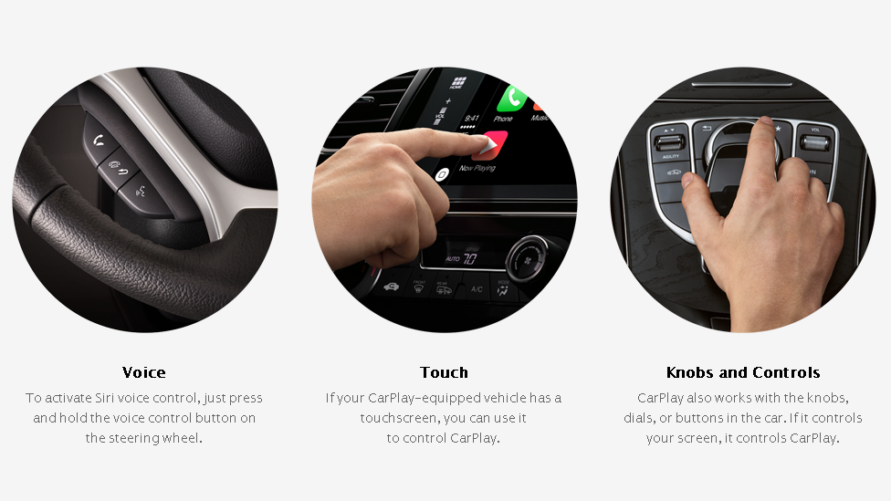 Con la integración de Siri, los comando de voz serán la mejor opción para que no tengas que quitar las manos del volante y siempre estés alerta del camino. Sin embargo no es la única forma de utilizar el servicio ya que los botones, el panel táctil y los controles del volante también serán compatibles para poder controlar toda la plataforma.