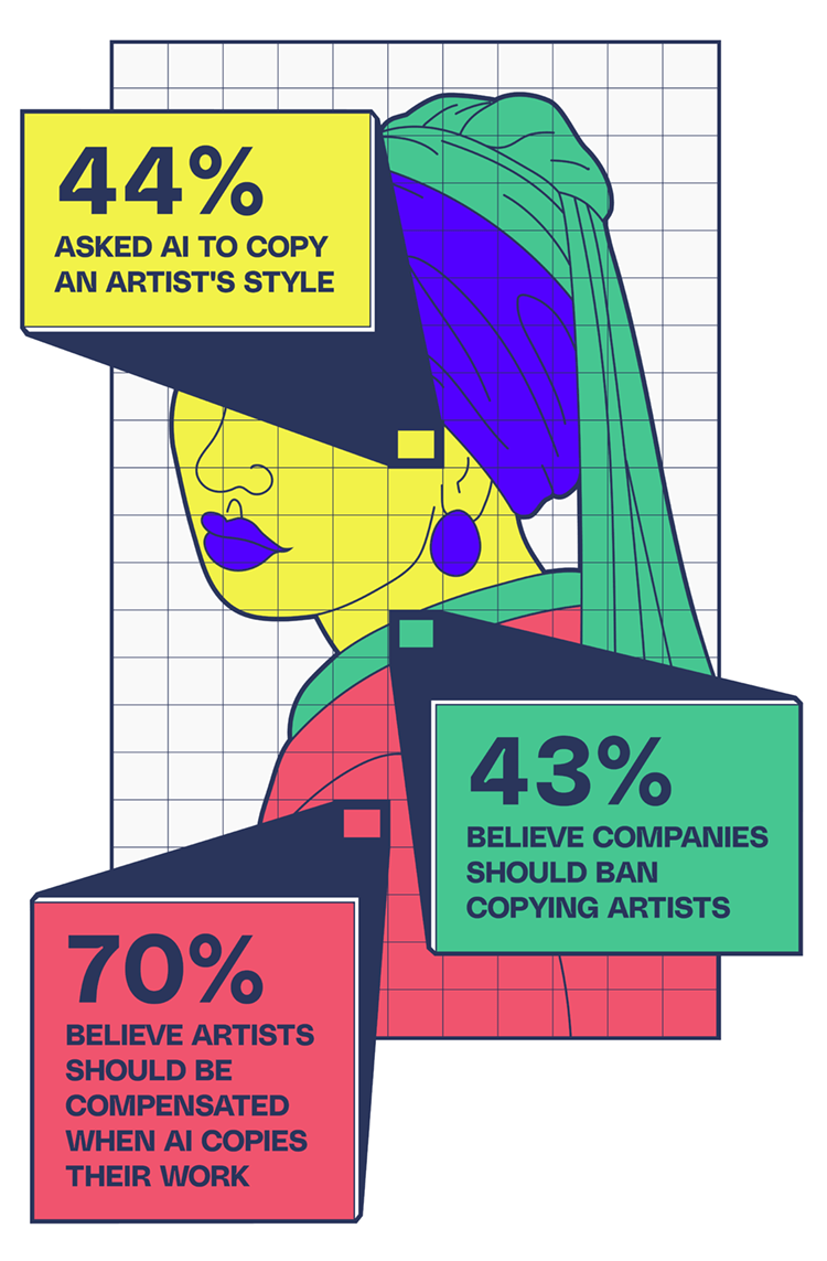 Debido a que la inteligencia artificial es nueva para muchas personas, existen ciertos dilemas éticos respecto a esta. Esto se debe a que muchos utilizan IA para crear imágenes, música y textos con base a otros artistas, músicos o escritores. Por este motivo, el 70% piensa que los artistas deberían recibir una compensación cuando una IA copia sus trabajos para crear una nueva pieza. Por otro lado, un 44% le pidió a la IA que copie una estilo de un artista, mientras que un 43% piensa que las compañías deberían bloquear los artistas que copian.