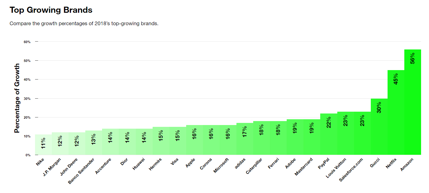 En cuanto a las empresas que más crecieron en el año, Amazon lidera el grupo. Seguida por Netflix, la plataforma de streaming que ha ‘reinventado’ la manera de ver productos audiovisuales. Mientras que en el tercer puesto se encuentra Gucci, una marca de ropa con gran demanda en los últimos tiempos.