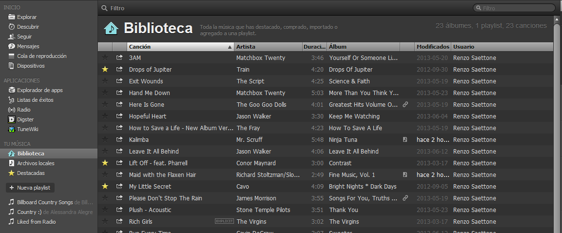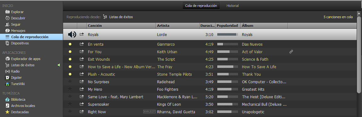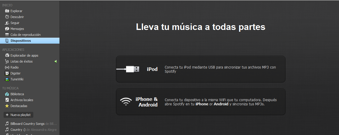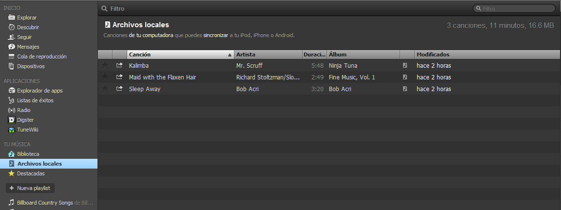 Aquí encontramos toda la música almacenada en nuestra computadora para ser reproducida. De esta forma podemos utilizar a Spotify como reproductor alternativo a Windows Media Player, Winamp o iTunes.
