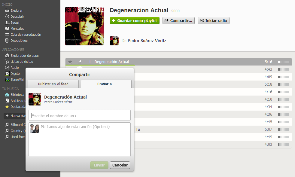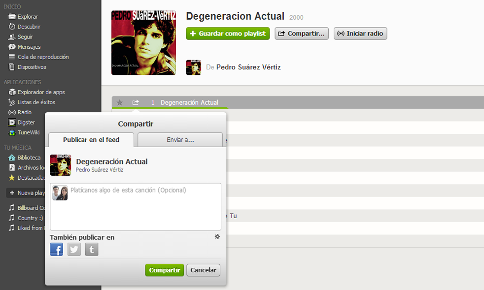 Cada canción/playlist tiene un ícono que permite compartir la música en Facebook, Twitter o Tumblr. También puedes enviar la canción/playlist a algún amigo de Facebook o persona que sigas en Spotify.