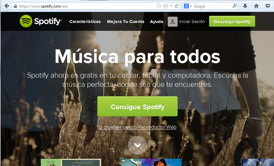 Lo primero que debemos hacer es ingresar a la web https://www.spotify.com/pe para poder registrarnos (recomiendo usar la opción de Facebook) para luego descargar el programa.