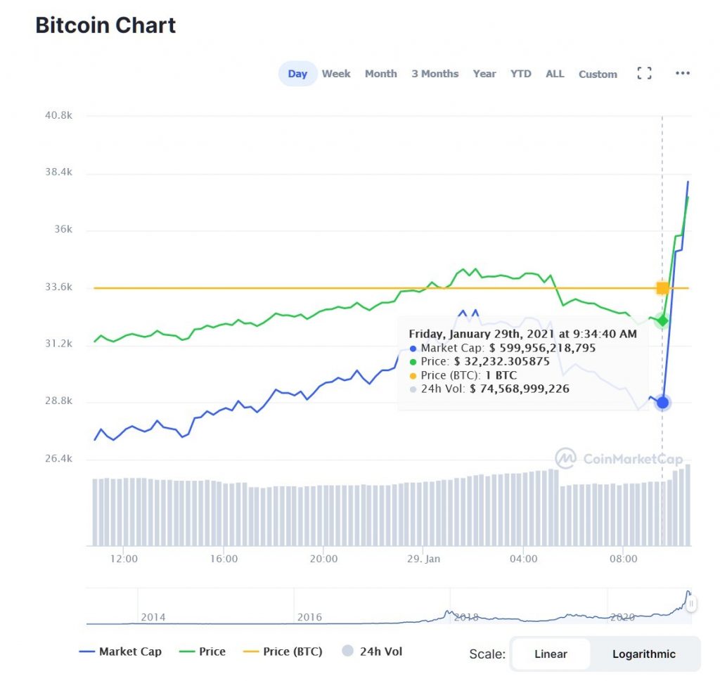 El valor de esta criptomoneda se encontraba inestable esta última semana. Se obtuvo un pico superando los 40.000 dólares, sin embargo, su valor decayó hasta los 31.000 dólares. Es en este momento donde sucede el cambio de bio de Elon Musk, incrementando su precio hasta 5000 dólares llegando al total de 37.500 dólares.