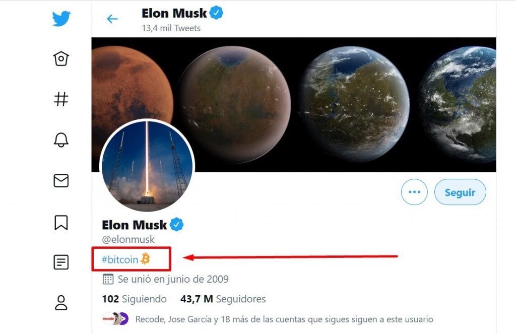 Cada vez se demuestra la influencia que tiene Elon Musk en la industria. El famoso dueño de Tesla, Neuralink y SpaceX agregó el mensaje de #bitcoin en su descripción personal ocasionando un incremento en esta moneda digital alucinante. Si bien parece un cambio bastante insignificante, esta simple palabra fue suficiente para que el bitcoin incrementara su valor en 5000 dólares en una hora.