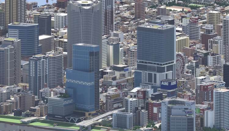 Lo que ves aquí es la ciudad de Sayama, una ciudad Japonesa ficticia creada en MineCraft, inspirada en Osaka, Tokyo, y otros lugares nipones.