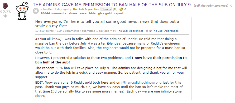 Sin embargo, debido al rápido crecimiento de la comunidad, se volvió una especie de meme entre los usuarios de que en algún punto la mitad de los miembros deberían ser banneados, una masacre al azar de cientos de miles de redditors en nombre del balance perfecto.