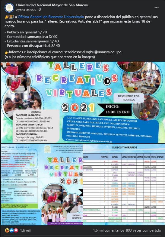 A modo de fomentar la recreación, la Universidad Nacional Mayor de San Marcos publicó en su cuenta de Facebook los «Talleres recreativos Virtuales” que realizará durante esta temporada de verano 2021. Estos cursos están focalizados para estudiantes y público en general que esté interesado.
