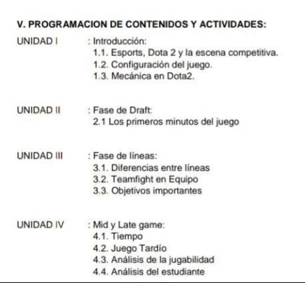 Sin embargo, lo que más llamó la atención de varios usuarios de redes sociales fue el ofrecimiento de un “Taller de Dota” para jóvenes y niños de 8 años a más. Según el sílabo publicado, las competencias a desarrollar incluyen la posibilidad de “identificar los aspectos positivos y negativos de los eSports, específicamente en Dota 2” entre otros. El curso se divide en cuatro unidades las cuales son llamadas Introducción, Fase de Draft, Fase de líneas y “Mid y Late game”.