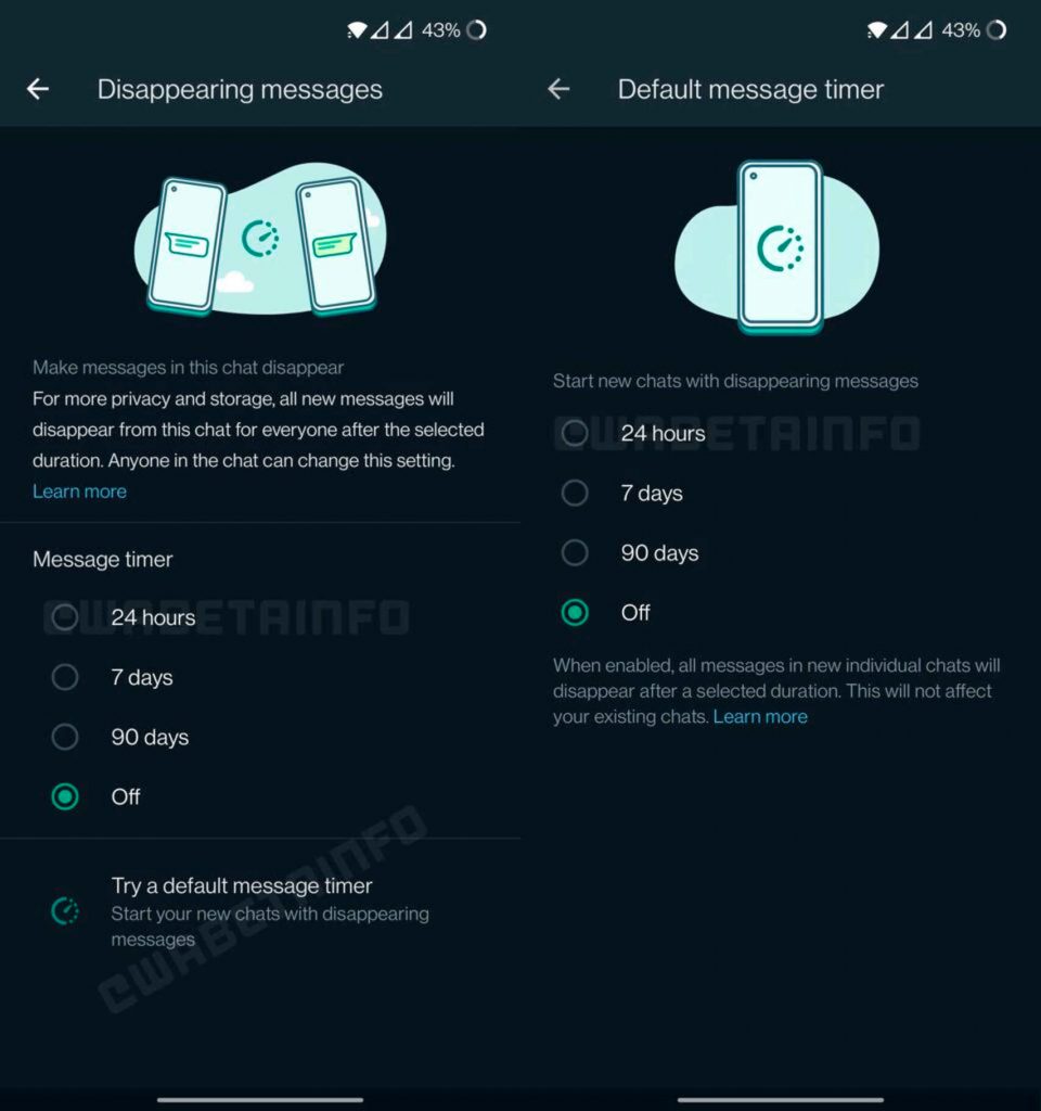 WhastApp nos da la posibilidad de establecer la duración de los mensajes empezando desde 24 horas, 7 días, 90 días y desactivado. Se puede personalizar esta opción por chat y no necesariamente entre todas tus conversaciones. Si no desean instalar la versión beta, que puede contener algunos errores, pueden esperar algunos días o semanas para que esta función sea liberada para todos.