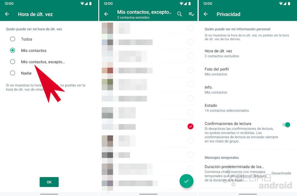 Hasta ahora WhatApp permite solamente restringir estos datos a todo el mundo. La nueva característica ha llegado a la última beta de WhatApp permitiéndonos ocultarnos de algunos contactos en específico. Los que se agreguen a esta lista no podrán ver nuestra foto de perfil, información y, lo más importante, nuestra última hora de conexión.