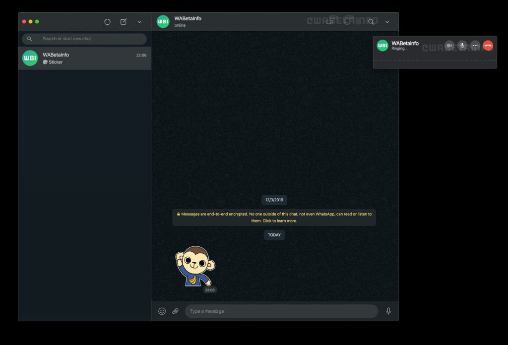 Las videollamadas o llamadas se encuentran presentes en la versión beta de WhatsApp Web 2.2043.7. Se da la opción de recibir videollamadas, así como iniciar una mostrando una pequeña ventana pop-up con el nombre del usuario y sus detalles.