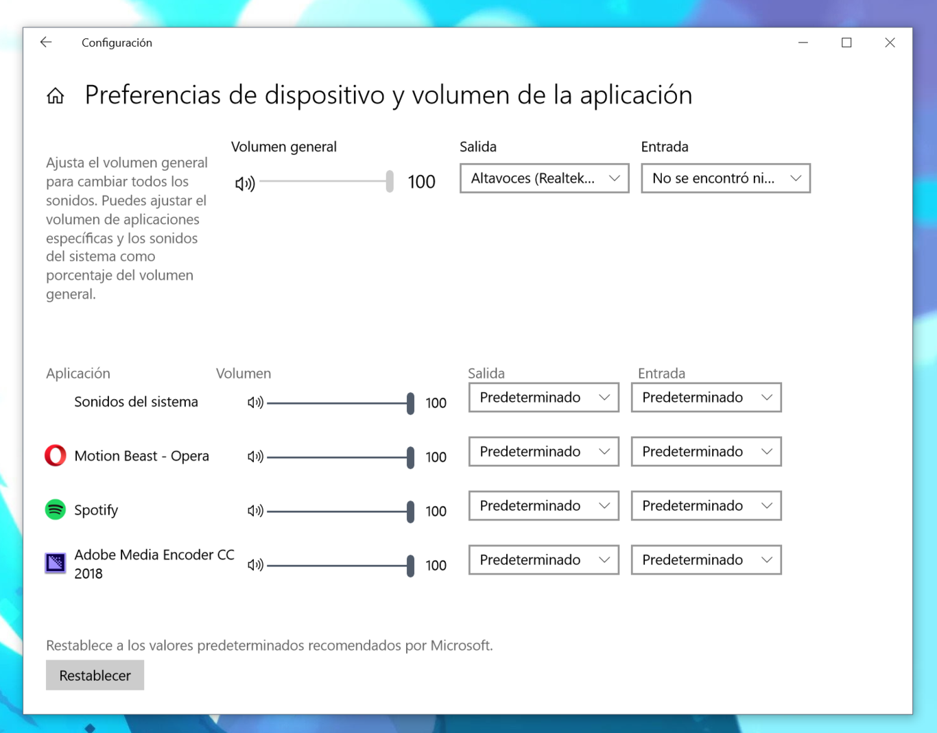 De esta manera, este apartado de audio ahora se titulará ‘Preferencias de dispositivos y volumen de la aplicación‘. Y solamente aquí podremos administrar el volumen de los programas, además de las entradas de micrófono y parlantes.