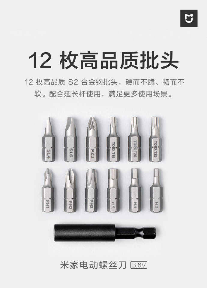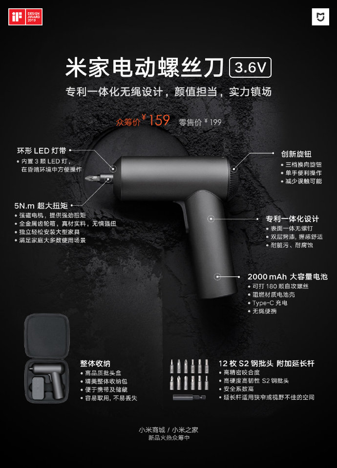 Se incluyen 12 puntas de acero de dureza HRC60. El destornillador eléctrico tiene una batería de 2.000 mAh. En tan solo 1 hora de lanzado al mercado se lograron vender unas 10.000 unidades en China. El precio oficial es de 159 yuanes que equivaldrían a 23.11 dólares.