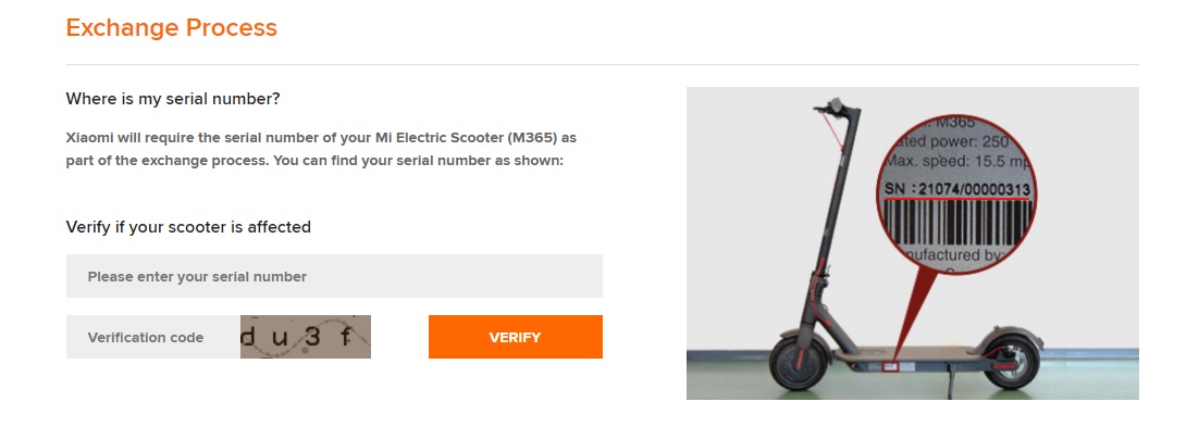Afortunadamente, Xiaomi abrió una web para identificar si tu scooter eléctrico pertenece a esta ‘camada’. En esta página web puedes colocar el número de serie, el cual está en un sticker al lado de la ‘pata de cabra’ de tu dispositivo.