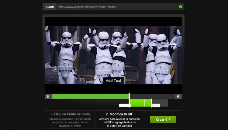Puedes acceder a la herramienta desde imgur.com/vidgif , colocas la URL del video, luego puedes recortar el inicio y fin de la animación y por último, agregarle texto.