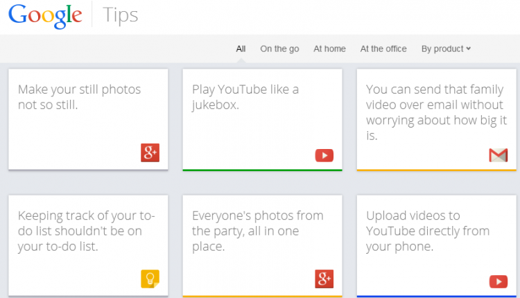 Es por eso que ha lanzado una web llamada «Google Tips» (actualmente en inglés) donde te muestra consejos y trucos sobre sus diversos productos. Los tips son mostrados en formato de tarjetas. Sólo basta hacer clic sobre una de las tarjetas y seguir los pasos que esta indica.