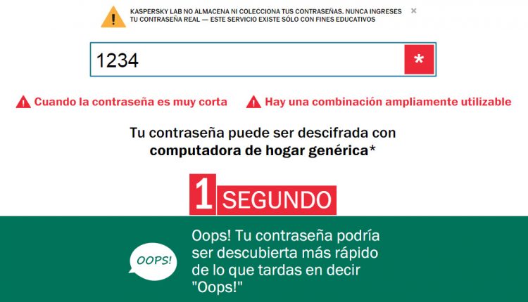 Si tienes una clave como 1234 o qwertyuiop lo más probable es que sea muy fácil para hacker (o una persona común) adivinar e ingresar tus cuentas. Así que para saber qué tan seguro es tu password, Kaspersky te presenta una herramienta que te muestra cuánto tiempo tomaría descifrar tu contraseña. Aquí el Link: