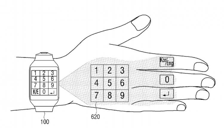 Samsung acaba de presentar un documento a la Oficina de Patentes de Estados Unidos. Se trata de un concepto para un nuevo reloj que proyecta un teclado virtual sobre tu mano y detecta qué teclas presionas. Esto es gracias a un pico-proyector, que también podría mostrar imágenes sobre otras superficies.